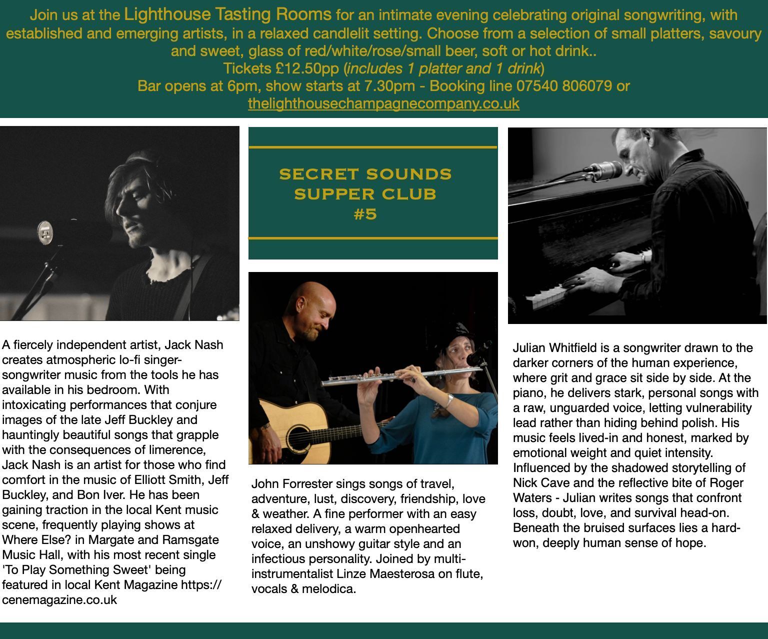 Join us at the Lighthouse Tasting Rooms for an intimate evening celebrating original songwriting, with established and emerging artists, in a relaxed candlelit setting. Choose from a selection of small platters, savoury and sweet, glass of red/white/rose/small beer, soft or hot drink...